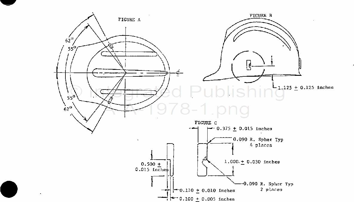 The fireman’s helmet shall consist of a shell, headband, sweatband, crown straps, adjustable chin strap, and nape strap. The helmet shell shall be a cap style with a brim measuring 1-1/2 to 3 inches long. The helmet shall meet the requirement for type II, class B helmet in ANSI Standard Z89.1 – Protective Headwear for Industrial Workers. The issue of the ANSI Standard in effect on the date of the solicitation shall be used to determine compliance with these requirements. The helmet shell shall be made from polycarbonate with a melting point not less than 3500 F. The color of the helmet shall be yellow. The helmet shall also be provided with three nonmetallic headlamp clips; one located at the center back of the helmet, and two side clips located at either 550 + 20 or 620 + 20 from the center front (see figures A and B). For details and dimensions of headlamp clips, see figure C below. Dimensions not shown shall be at the supplier’s option. For those helmets with a bottom ridge, additional stock may be added to the clip to facilitate clearance over the bottom ridge of the helmet.